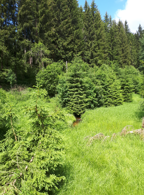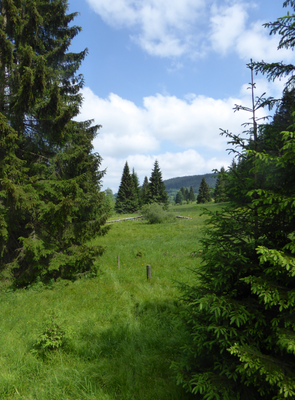 Über einen breiten Weg geht es hinab zur Grenze. Immer wieder findet man schöne Aussichtspunkte. Direkt an der Grenze überquert man eine kleine Brücke. Hier scheint die Zeit still zu stehen. Grenzpfosten, eine alte Panzersperre u.v.m. erwarten uns hier. Links und rechts neben der Brücke ist ein Sumpfgebiet und die Hochburg der Kreuzottern. Hier soll die größte Population in Europa leben. Wir haben aber keine gesehen :-).