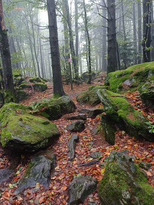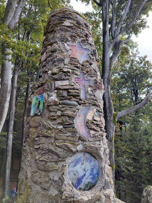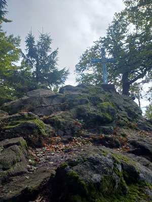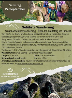 Heute darf ich als Wanderführer für die TI Waldmünchen eine Gruppe über den Gibacht führen und ihnen etliches rund um den Gibacht und den Goldsteig erzählen. Wir starten am Berghof Gibacht (Navi: Gibacht 31, 93449 Waldmünchen) und folgen dem Goldsteig, der uns zuerst zum Pfennigfelsen mit seinem "Tresor" und dem "Waldmünchen Blick" bringt. Über Pfade geht es an die deutsch-tschechische Grenze und zum Drei-Wappen-Felsen (hier haben die Königreiche Bayern, Böhmen und die Pfalz aufeinandergetroffen). Eine Infotafel und die in Stein geschlagenen Wappen weisen darauf hin. Neben dem Unterstand gibt es hier noch ein Gipfelkreuz. Weiter geht es über Metallstufen und Felsen zum höchsten Punkt des Oberpfälzer Waldes in Bayern- dem Kreuzfelsen. Ein gesicherter Aufstieg zum Gipfel ist möglich. Dann geht es weiter und wir erreichen als nächstes Highlight des Leuchtturm der Menschlichkeit auf den Tannenfels. Der Leuchtturm wurde aus Steinen aus der ganzen Welt errichtet. Ein magischer Ort. Weiter geht es zu einem der schönsten Gipfel des Bayerischen Waldes und zwar zum Reiseck mit Glaskreuz und perfekter Sicht hinab nach Furth im Wald. Nun gehen wir wieder zurück in Richtung Leuchtturm und gehen aber die letzten Meter nicht mehr hinauf, sondern folgen dem Waldweg, der uns zu einem Forstweg bringt. Hier biegen wir rechts ab und erreichen nach einigen Metern den Berghof Gibacht, wo wir noch eine gscheite Brotzeit gemacht haben.