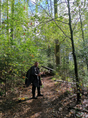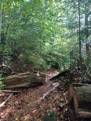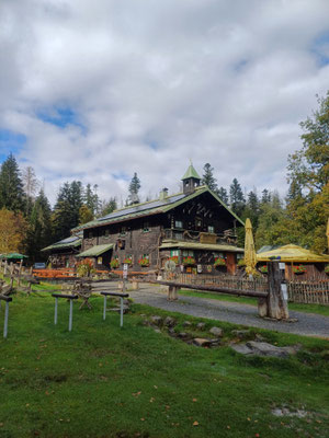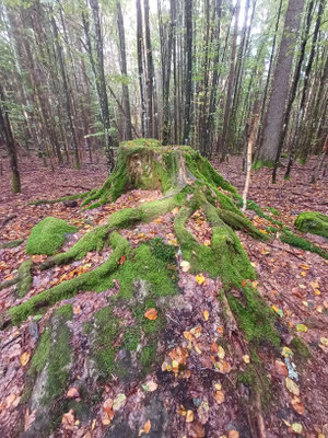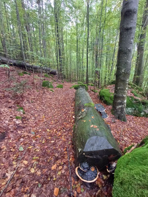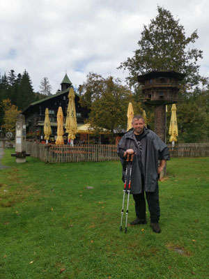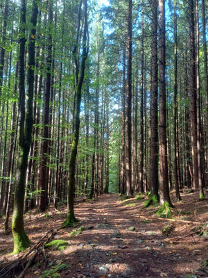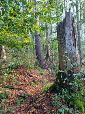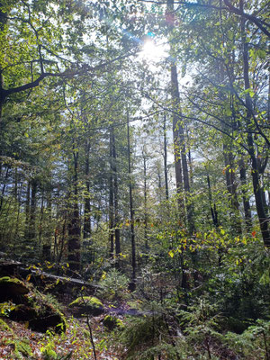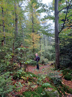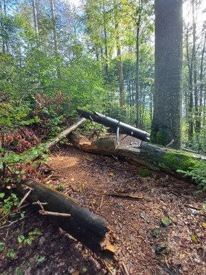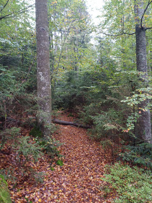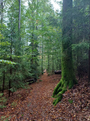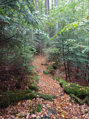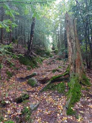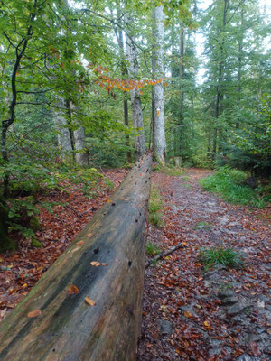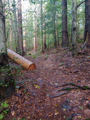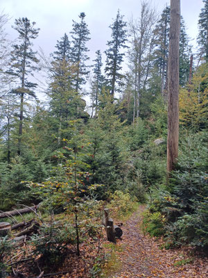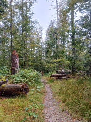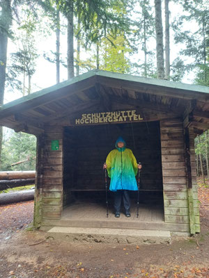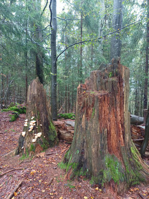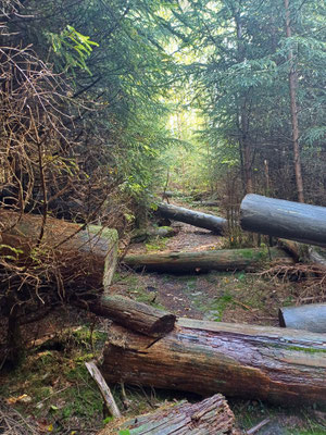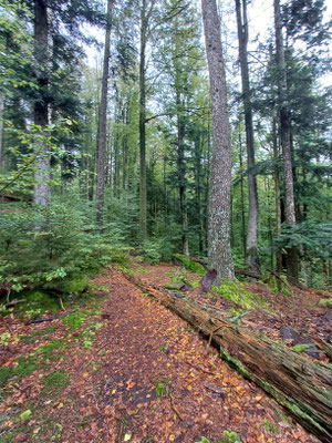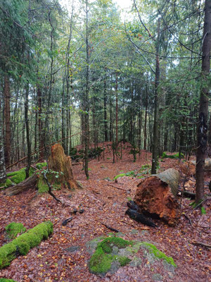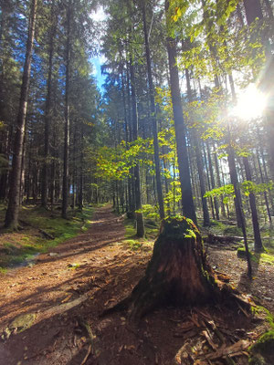 Mittlerweile ist die Sonne wieder aus ihrem dunklen Wolkenversteck hervorgekommen und wir sehen richtig schöne Lichtspiele. Wir folgen weiter dem Waldpfad, der uns nun in einer langgezogenen Linkskurve auf den Gipfel des Hochberg (914 m NHN) führt. Ein Gipfelkreuz gibt es nicht, aber zwei mächtige Baumstümpfe stehen an der höchsten Stelle des Weges und das sind für uns nun die Gipfelbäume :-). Jetzt beginnt der steile Abstieg. Nach 200 Metern biegen wir nach links auf einen Waldweg ein. Diesem folgen wir für weitere 250 Metern. Wir treffen auf einen Forstweg und verlassen den Urwaldsteig nach rechts. Unmarkiert geht es nun über den Forstweg bergab. Nach 500 Metern erreichen wir den Hochbergsattel, einen Unterstand und wieder den Goldsteig. Ach ja, mittlerweile regnet es wieder mal richtig heftig. Der Poncho hält :-).