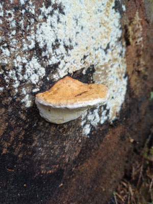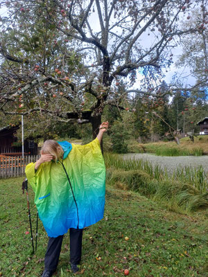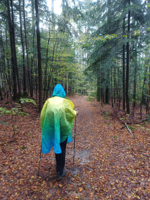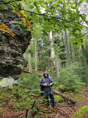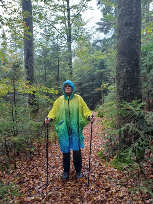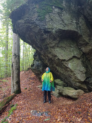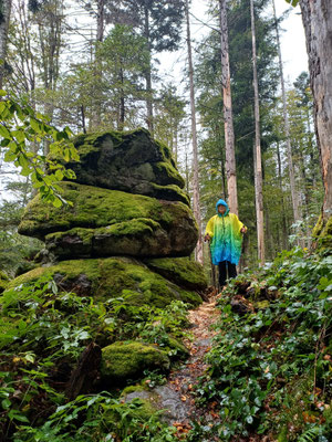 Der Urwaldsteig ist NICHT markiert, aber es gibt etliche Wegweiser auf der Strecke. Man folgt einfach immer dem Hauptweg und an den Kreuzungen trifft man auf die Wegweiser, die einem den nächsten Weg zeigen. Easy. Anfangs auf einem tollen Waldweg, der durch viele Felsen führt und über eine Art Steindamm. Mittlerweile hat es zu regnen begonnen = Einsatz für unsere neuen Ponchos. Wir testen diese, denn mit allen Regenjacken, die wir bisher hatten, sind wir nicht zufrieden. Nach einiger Zeit lassen sie das Wasser durch und auch schwitzt man stark unter der Jacke. Der Poncho ist das viel besser. Man bleibt trocken und schwitzt nicht mehr als sonst :-). Der Abschnitt des Urwaldsteigs, denn wir gerade laufen ist richtig cool. Er trägt den Namen "Johannessruhe".