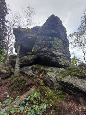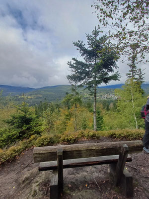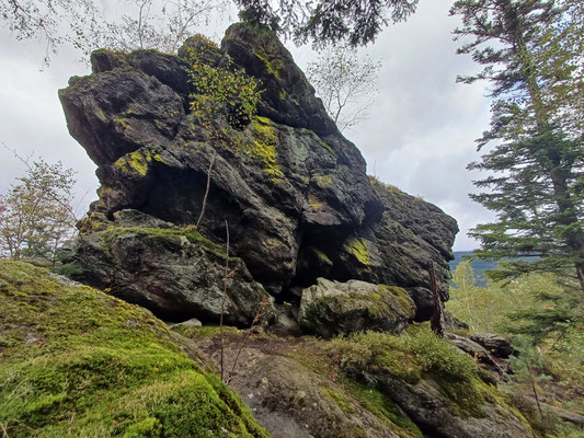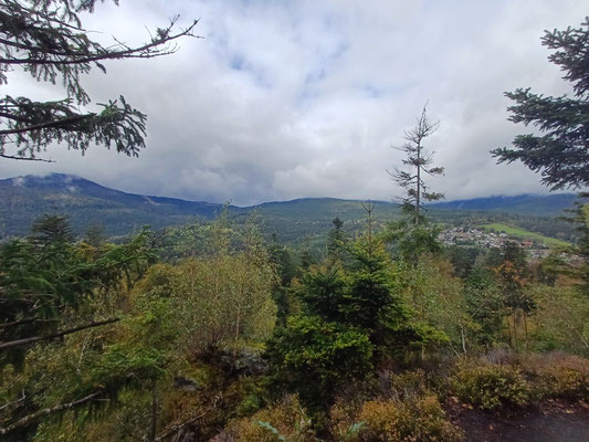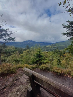 Es geht nun zuerst auf einem flachen Waldpfad am Hang entlang weiter. Dieser Abschnitt ist auch bereits ein Teil des Urwaldsteigs, der uns heute noch einige Zeit begleiten wird. Die flache Passage ändert sich wieder und der Pfad steigt wieder steil an. Ca. 400 Meter nachdem wir auf die "Haselmaus" abgebogen sind, haben wir auch schon das erste Highlight der Tour erreicht. Der Hochfels, ein Aussichtsfelsen liegt rechts neben dem Weg und über einen kurzen Abstecher erreichen wir diesen auch schon. Der Aufstieg führt uns über Wurzeln und viele Steine. Der Hochfels ist echt cool, denn von hier haben wir einen traumhafte Sicht auf den Großen Arber und hinab nach Bayerischen Eisenstein. TOP!