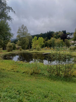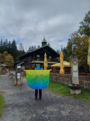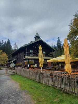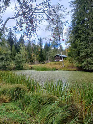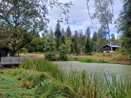 Am Forstweg geht es nach rechts und dann nach links zum Schwellhäusl hinab. Brotzeit machen wir heute keine dort, aber wir machen viele Fotos von der Location. Das Schwellhäusl ist ebenfalls wieder ein richtig uriger und schöner Ort. Der Weiher, das Gebäude und die Sonnenuhr sind schon "mega" :-).