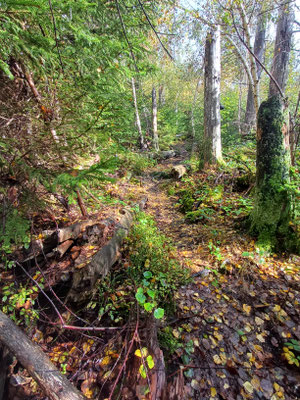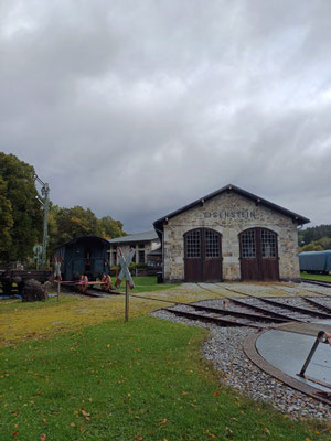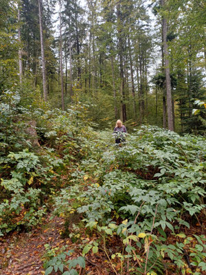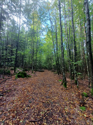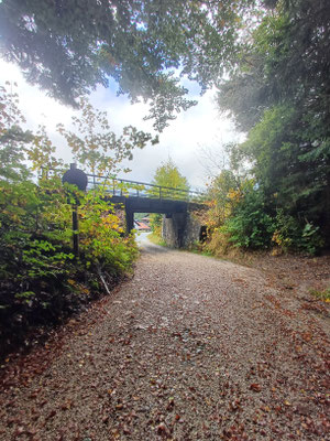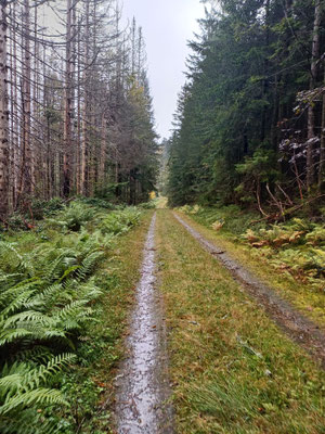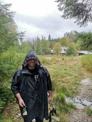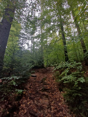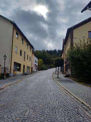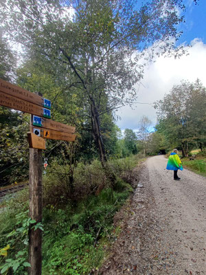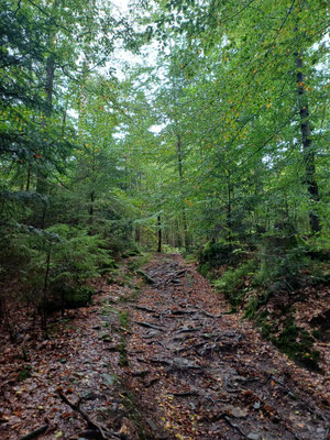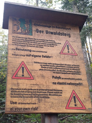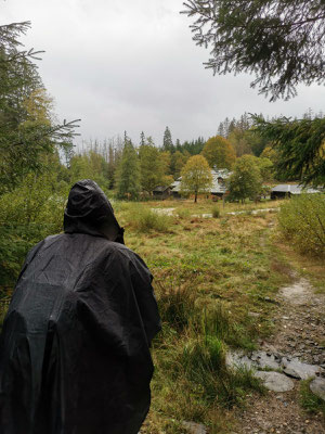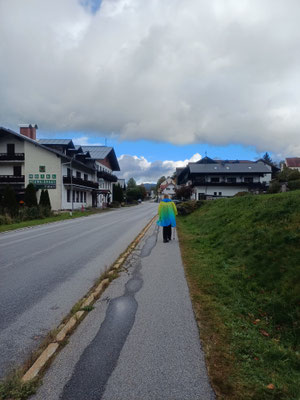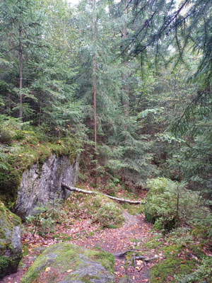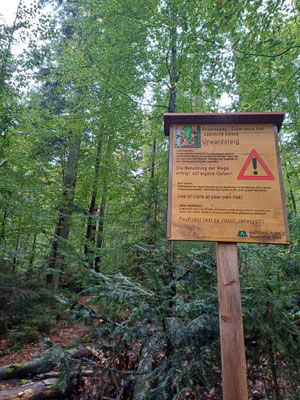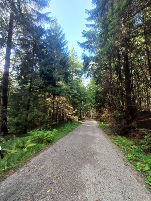 Am höchsten Punkt treffen wir auf einen Forstweg, dem wir nach rechts folgen. Dieser "zieht" sich wieder einmal, aber nach einen Kilometer haben wir es auch schon wieder geschafft, denn der Weg geht es jetzt nach links auf einem Waldweg weiter. Dieser führt uns nun wieder steil bergab und in Richtung Bayerisch Eisenstein. Nach 400 Metern treffen wir auf die Bahnlinie und einen Forstweg, dem wir nach rechts folgen. Es geht unter der Bahnlinie hindurch und schon sind wir auch schon in Bayerisch Eisenstein. Wir folgen der Hans-Watzlik-Straße bis zur Bundesstraße. Hier biegen wir nach rechts ab und folgen dieser auf dem Bürgersteig für 200 Metern. An der Sparkassenkreuzung biegen wir nach halbrechts ab und es geht nun über den Fußgängerweg zurück zu unserem Wanderparkplatz. Es ist 16 Uhr als wir zurückkommen. Die letzten Meter sind wir sogar gelaufen, denn es hat schon wieder angefangen zu regnen und da die Ponchos schon trocken waren, wollten wir so schnell wie möglich zurück zum CamperVan. Eine richtig coole Wanderung auf dem Urwaldsteig. Hammer.