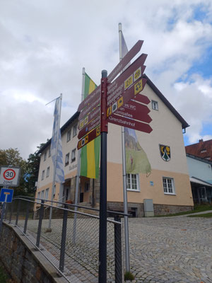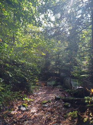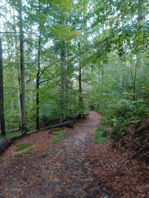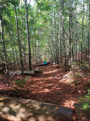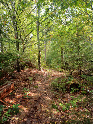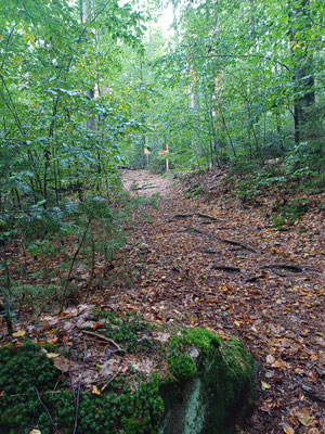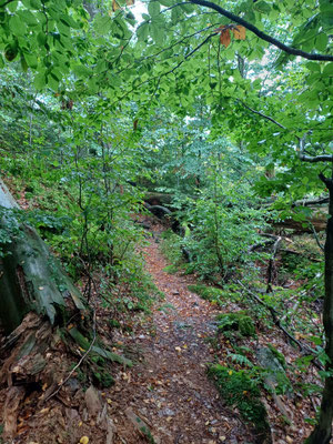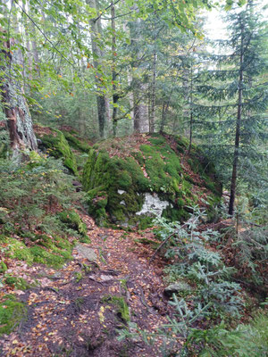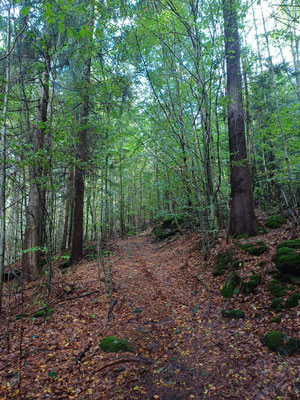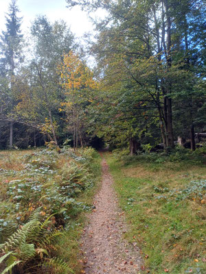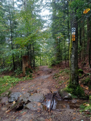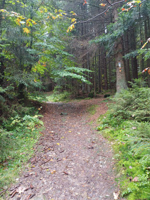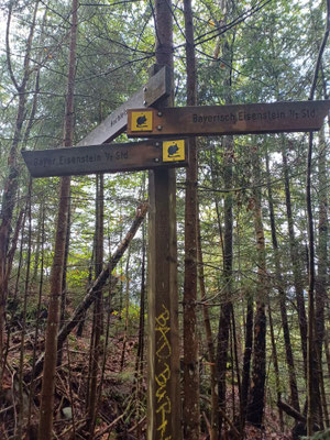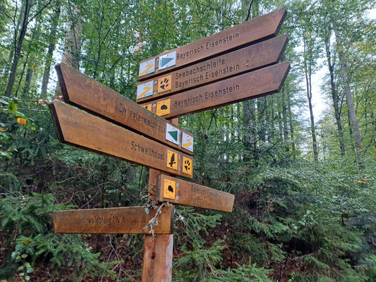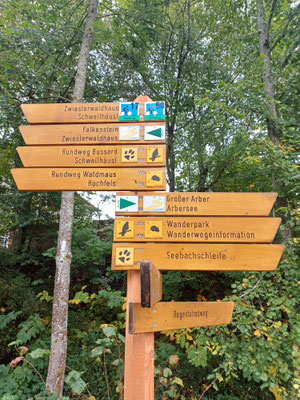 Vom Parkplatz geht es erst einmal nach links und auf der Hohenzollernstr. treffen wir auf den Goldsteig, dem wir nun folgen. Er führt uns über einen kleinen Berg hinauf in Richtung Grenzbahnhof und dann hinein in den Wald. Nach einem kurzen Stück auf dem Forstweg geht nach rechts auf einen steinigen Waldpfad weiter. Wir queren einen weiteren Forstweg und nach gut 100 weiteren Metern treffen wir auf einen Wanderkreuzung. Der Goldsteig würde hier nach links abbiegen. Wir biegen hier aber nach rechts ab und folgen der Markierung "Haselmaus". Die ersten 100 Höhenmeter sind geschafft :-).