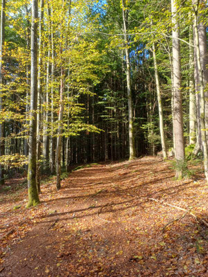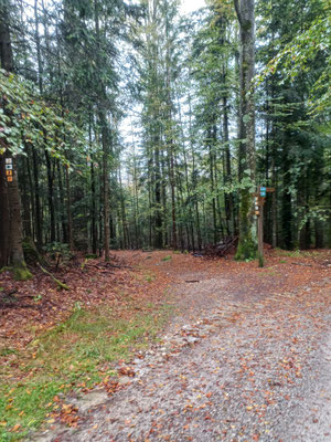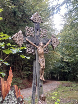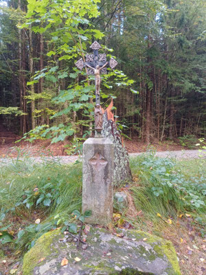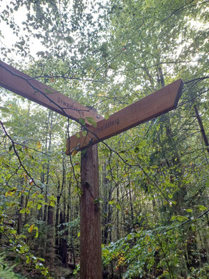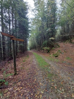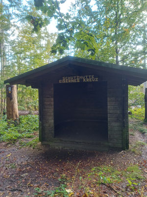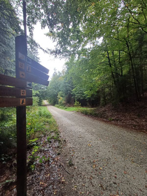 Es geht wieder hinauf zum Forstweg. dort befindet sich die nächste Wanderkreuzung. Wir folgen ab sofort der Markierung "Bussard", die uns zurück zum CamperVan bringt. Vom Forstweg geht es nach rechts hinein auf den nächsten Waldpfad und es geht wieder einmal bergauf. Einen Kilometer und 100 Höhenmeter später treffen wir auf das "Eiserne Kreuz" und eine Schutzhütte. Wir queren den Forstweg, der hier vorbeiläuft und wandern parallel zu diesem für weitere 400 Metern auf einem wurzeligen Pfad weiter. Ach ja, natürlich bergauf.