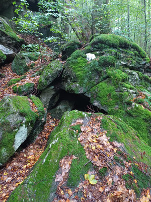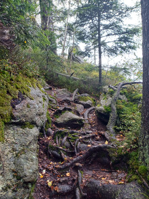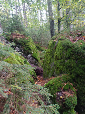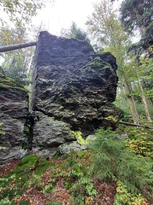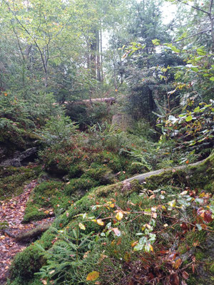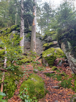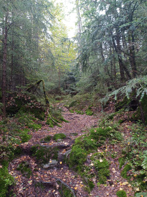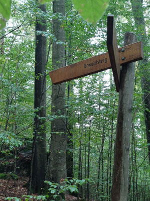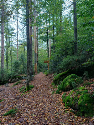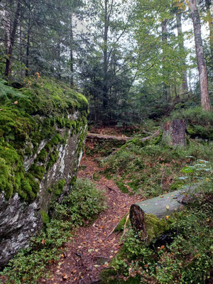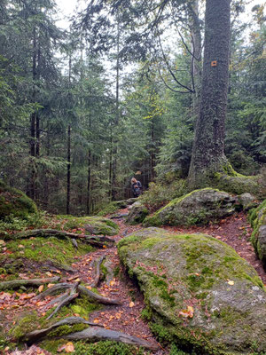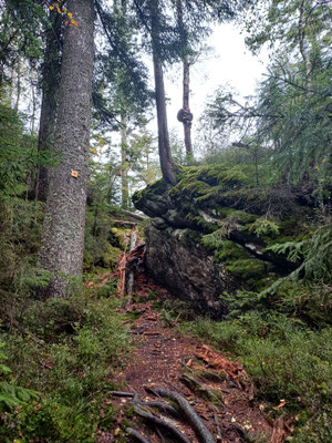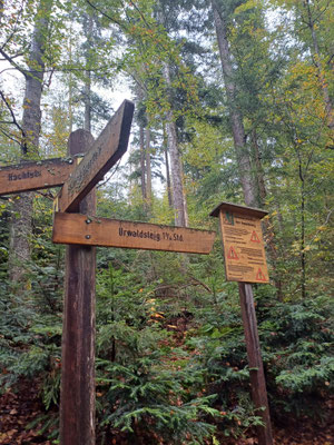 Es geht wieder zurück auf den Wanderweg "Haselmaus" bzw. auf den Urwaldsteig. Über eine kleine Felsenschlucht geht es weiter bergauf. Der Weg ist super zu laufen, so macht das Wandern Spaß. Es scheint zwar keine Sonne, aber mit dem Nebel ist es auch schön - alles recht mystisch heute. Es geht einmal um den Hochfels herum und auf der anderen Seite durch einen Urwald wieder bergab. Üppige Pflanzen stehen am Rand des wurzeligen steilen Pfades. Nach 300 Metern treffen wir nach dem Abstieg über eine Naturtreppe auf einen Wegweiser. Hier verlassen wir die "Haselmaus" und folgen nun dem "Urwaldsteig".