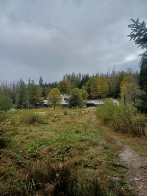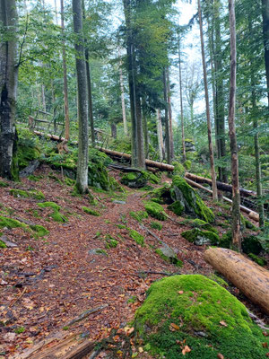 Wow, der Urwaldsteig hat seinen Namen nicht von ungefähr. Das war echt super. Wir folgen aber jetzt wieder dem besten aller Wege, dem Goldsteig :-). Es geht nach rechts und an der nächsten Forstwegkreuzung biegen wir nach links und gleich dahinter nach rechts auf einen Waldweg ein. Steinig und wurzelig geht es nun nur noch bergab. Nach 200 Metern biegen wir nach rechts ab (dort steht ein Wegweiser) und der Waldweg geht weiter bergab. Wir queren einen Forstweg und nach 400 Metern den zweiten Forstweg. Wir sind jetzt schon in der Waldpfad-Einflugschneise zum Schwellhäusl. Durch einen weiteren Urwald geht es weiter bergab und nach 700 Metern haben wir den ersten Blick auf das Schwellhäusl.