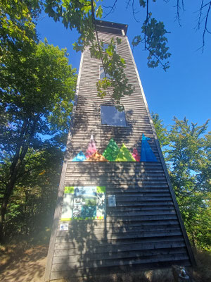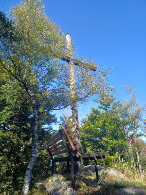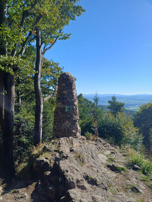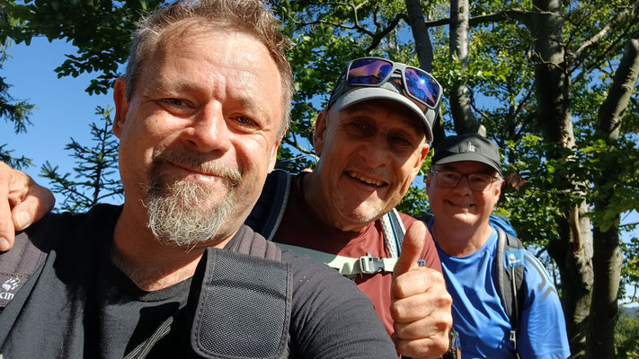 Heute bin ich wieder mit zwei ehemaligen Bankkollegen unterwegs. Mit dem Christian und dem Christoph wollen wir heute von Herzogau über den Klammerfelsen und den Gipfeln des Gibacht nach Voithenberg wandern. Wir sind mit zwei Autos unterwegs und parken eines am Ziel am Wanderparkplatz in Voithenberg (Navi: Linienweg, 93437 Furth im Wald) und fahren mit dem anderen Auto zum Start zur Waldvereinshütte in Herzogau (Navi: Von-Voithenberg-Straße 56, 93449 Waldmünchen). Wir folgen heute immer dem Goldsteig. Es geht auf einem Forstweg los und schon nach ein paar hundert Metern biegen wir nach rechts auf einen Waldweg ein, der auch bald zu einem steilen Pfad wird. Oben angekommen biegen wir nach links und folgen dem steinige Grat des Klammerfelsen. Nach 1,3 km und gut 100 HM sind wir da. Es erwarten uns ein Gipfelkreuz und ein paar Meter weiter ein Aussichtsturm mit schöner Rundumsicht, inkl. Cerchov-Blick. Natürlich steigen wir hinauf :-).