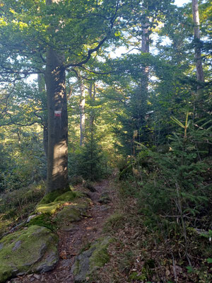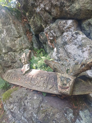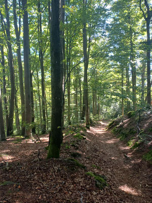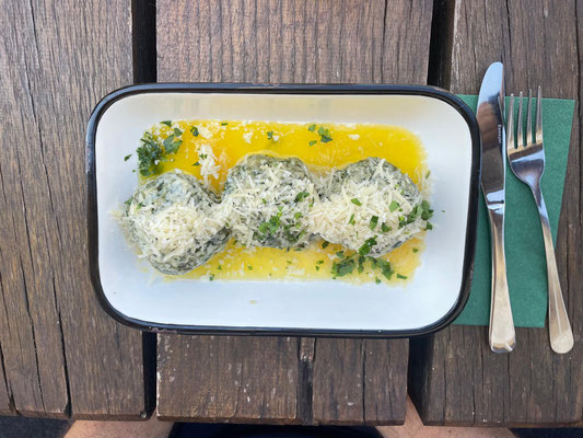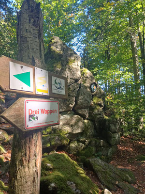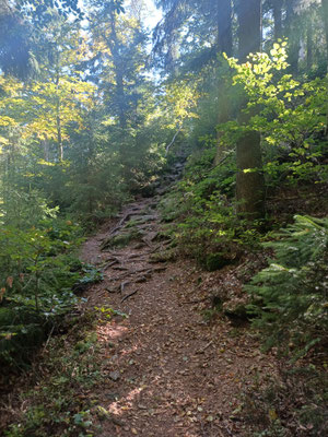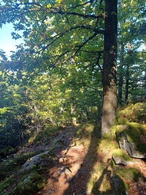 Der nächste Abschnitt ist besonders schön. Ein schmaler Steig führt uns am Grat entlang. Mal rauf, mal runter, mal links an Felsen vorbei, mal rechts an Felsen vorbei und ab und an gibt es einen Aussichtsplatz. Coole Sache. Nach 700 Metern erreichen wir einen Waldwiese und biegen hier nach rechts ab. Jetzt folgen wir einen steinigen Hohlweg durch einen schönen Laubwald. Wellig geht es am Goldsteig für gut zwei Kilometer weiter. Wir erreichen eine Wiese und sehen schon Althütte vor uns. Im Ort biegen wir links ab und dann wieder rechts und folgen der Straße hinauf zum Berghof Gibacht. Wir haben fast Halbzeit und so machen wir hier eine Rast und bestellen uns was zum Essen. Für mich gibt es Spinatknödel und zwei Radler :-). Das Wetter ist super. Wir sitzen in der Sonne und ratschen eine Ewigkeit und irgendwann brechen wir dann doch wieder auf. Haben wir doch noch ein paar KM vor uns.