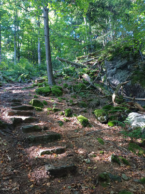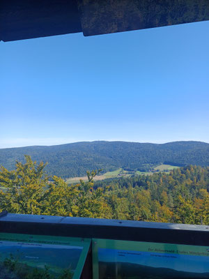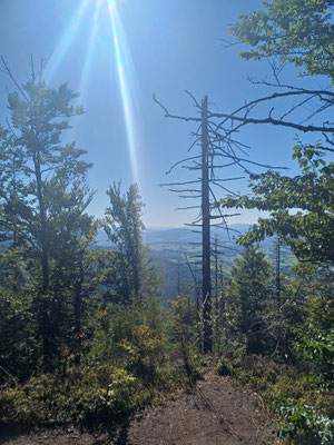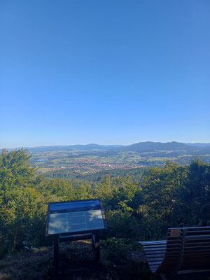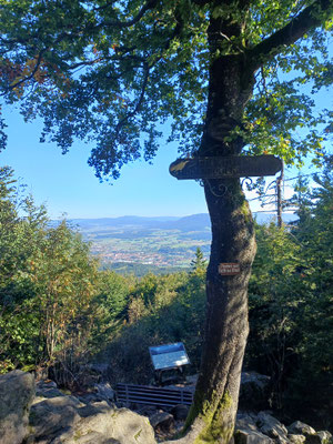 Endspurt! Der Abstieg beginnt. Über einen steilen und steinigen Pfad geht es bergab und nach 1,5 km und 220 HM im Abstieg erreichen wir den Gaißriegel mit der Robert Hütte. Hier sollte man einmal um das Gebäude gehen, denn dahinter befindet sich ein sehr cooler Aussichtplatz mit Blick hinab nach Furth im Wald. Hier machen wir unsere letzte Pause und ratschen bis wir feststellen, dass es gleich 17 Uhr ist und wir schon gut sieben Stunden unterwegs sind :-). Also machen wir uns auf und nach einem guten halben Kilometer am Goldsteig erreichen wir Voithenberg. Hier müssen wir an der Kapelle nach links abbiegen und sind nach ein paar Metern am Wanderparkplatz mit dem zweiten Auto.